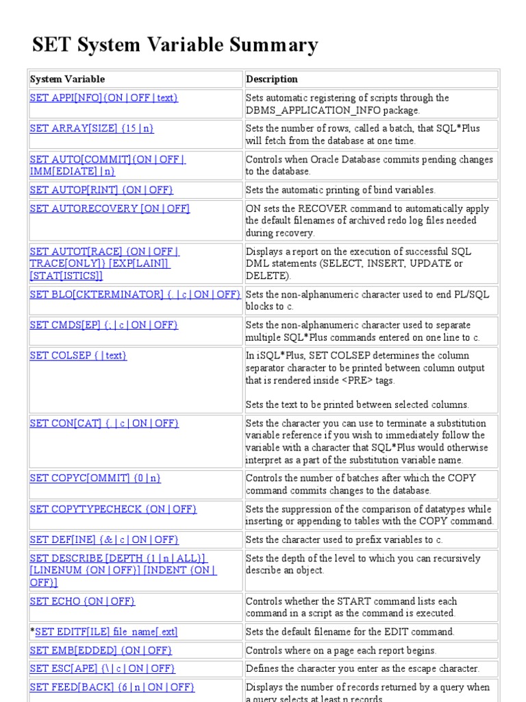 SQLPLUS SET System Variable Summary Pl/Sql Oracle Database